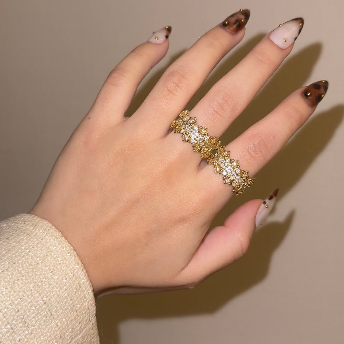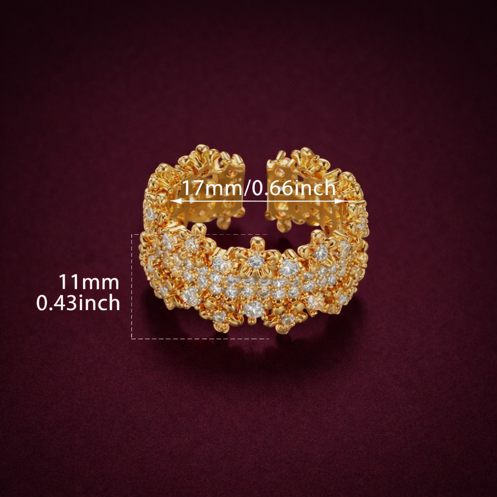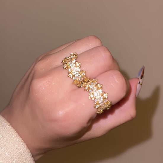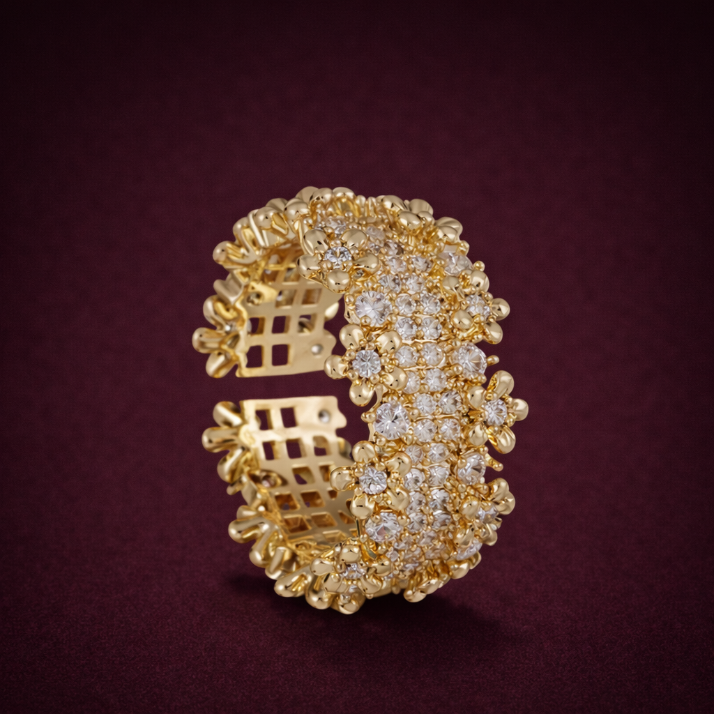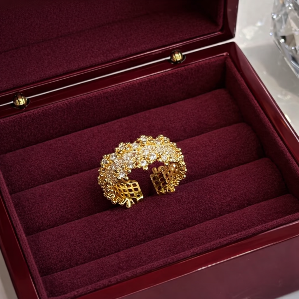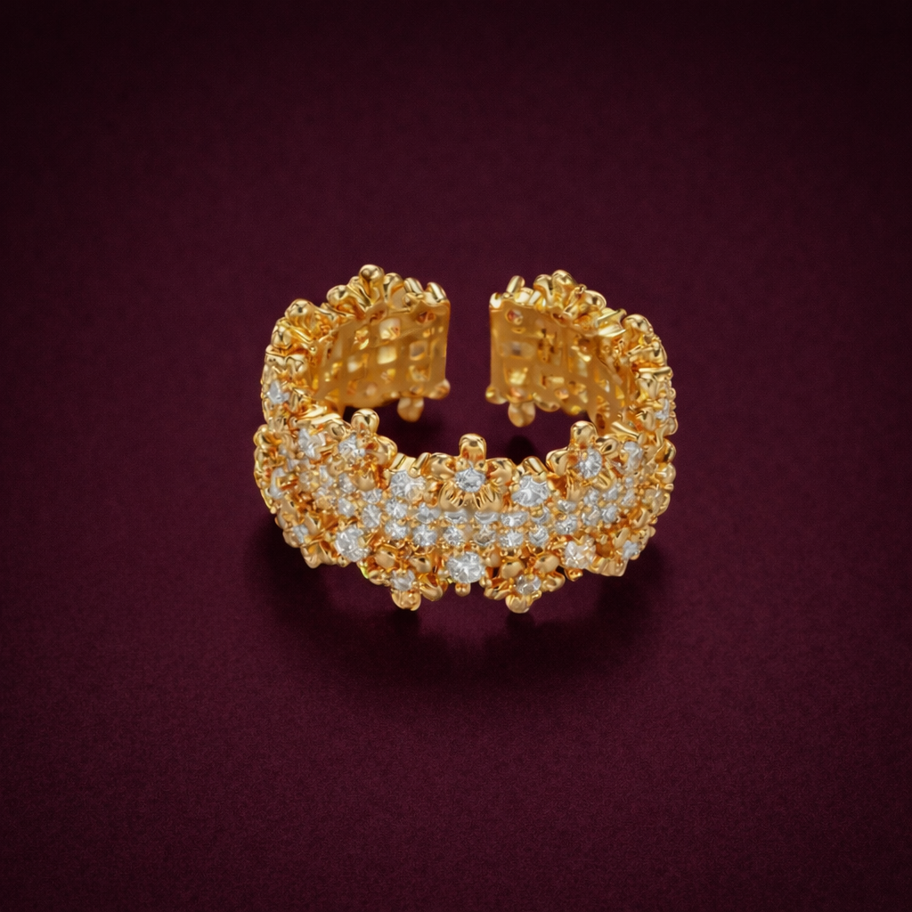 Quenelleは、複雑なレースのような構造と大胆な輝きを組み合わせたリングで、自立心、勇気、高まる声の象徴です。